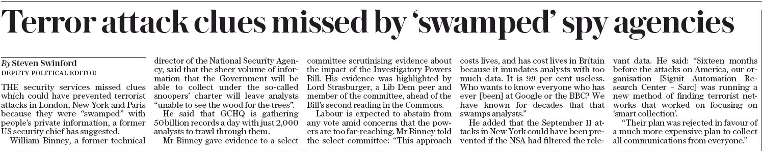 Also, two years ago a huge tranche of similarly hoarded NSA weapons was acquired by a criminal organisation called the Shadow Brokers, who initially tried to sell them on the dark web to the highest bidder but then released them into the wild. The catastrophic crash of NHS computers in the UK last year was because one of these cyber weapons, Wannacry, fell into the wrong criminal hands. How much more is out there, available to criminals and terrorists?